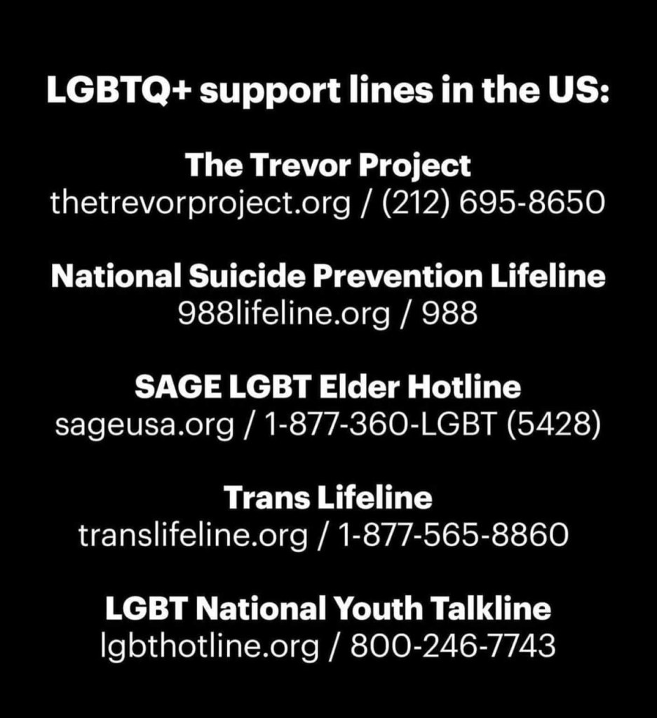 – The Trevor Project Lifeline (1-866-488-7386)
