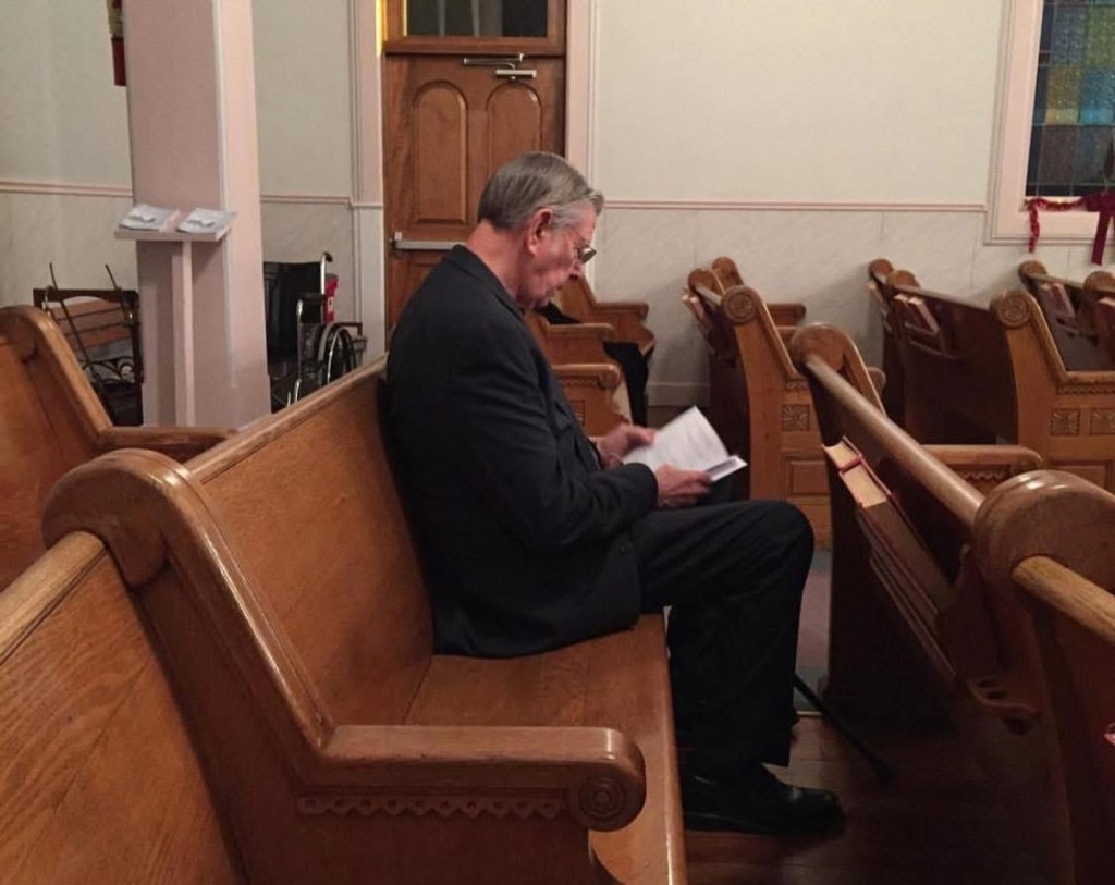 All of that work had been done on this night. Everything was ready. We were waiting for people to begin arriving for the service. My dad was sitting in the spot he sat every Sunday. On the day of his funeral, I sat in this same spot for a while, talking to him within my mind before everyone arrived. It made me feel closer to him somehow.